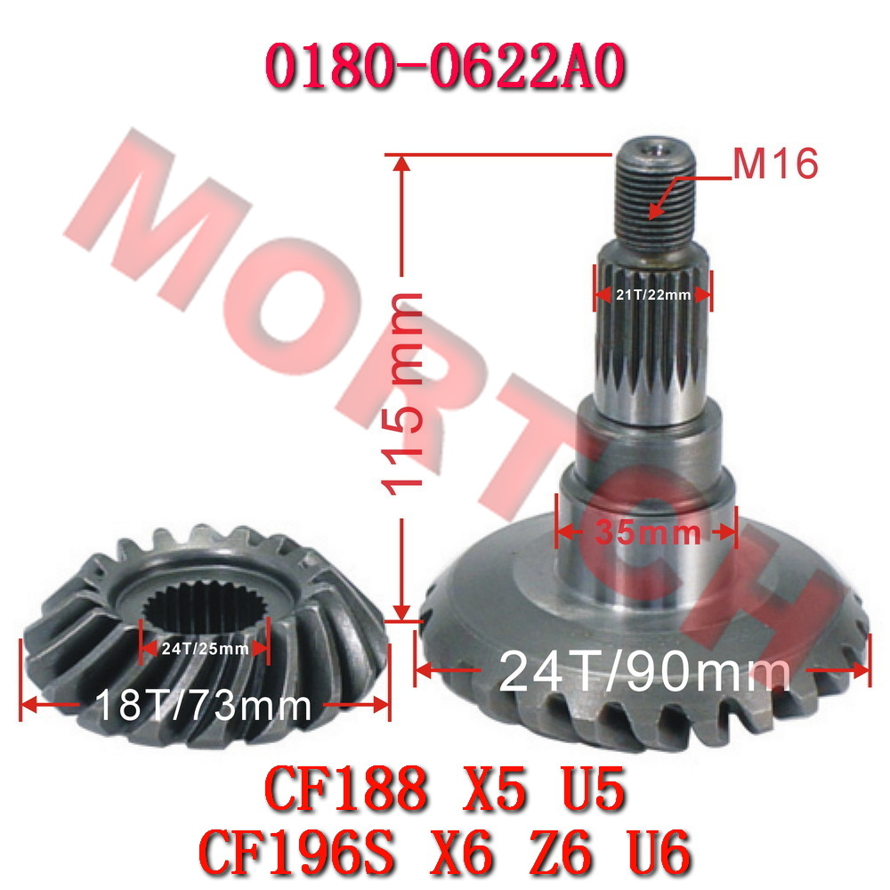 This drive and driven bevel gear set is a genuine quality replacement part for CFMoto vehicles. It includes the drive bevel gear and driven bevel gear for the final drive system, transmitting power to the drive wheels. Directly replaces OEM part number 0180-0622A0.