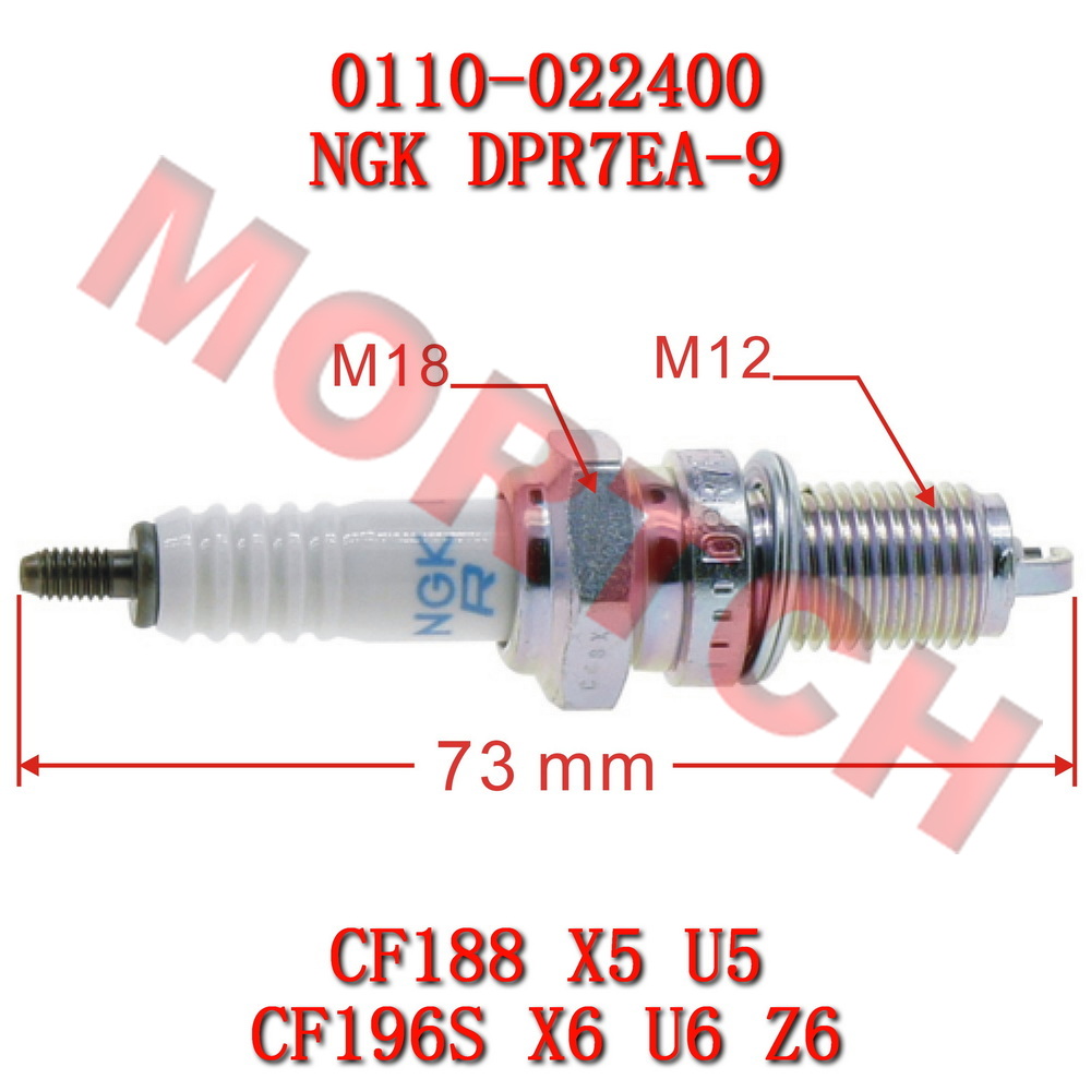 📌 Technical notes: NGK DPR7EA-9 spark plug, gap 0.9mm, resistor type. OEM CFMoto part numbers 0110-022400 / 172MM-022400, Linhai part numbers 35105 / 1BE-11130-00.